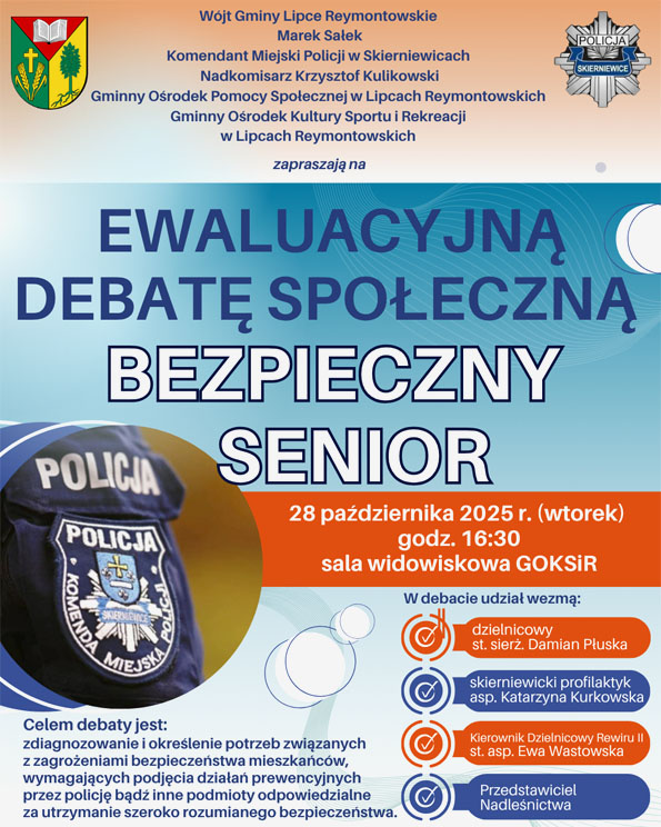 W dniu wczorajszym na zaproszenie Wójta Gminy Marka Sałka i Komendanta Miejskiej Policji w Skierniewicach nad. Krzysztofa Kulikowskiego w Gminnym Ośrodka Kultury Sportu i Rekreacji odbyła się debata społeczna pt. „Bezpieczny Senior”. Spotkanie poświęcone było bezpieczeństwu seniorów m.in. zagrożeniom na jakie narażone są osoby starsze ze strony oszustów, sposobami działania oszustów. Policjanci zapoznawali i zachęcali słuchaczy do korzystania z Krajowej Mapy Zagrożeń Bezpieczeństwa. Debatę poprowadzili eksperci Komendy Miejskiej Policji w Skierniewicach: Komisarz Robert Zwoliński - Naczelnik Wydziału Ruchu Drogowego, st. asp. Ewa Wastowska - Kierownik II Rewiru Dzielnicowych, mł. asp. Aneta Placek - Oficer Prasowy, st. asp. Marcin Kleczko - Zespół ds. Profilaktyki Społecznej, Nieletnich i Patologii, st. sierż. Damian Płuska -Dzielnicowy Gminy Lipce Reymontowskie.
