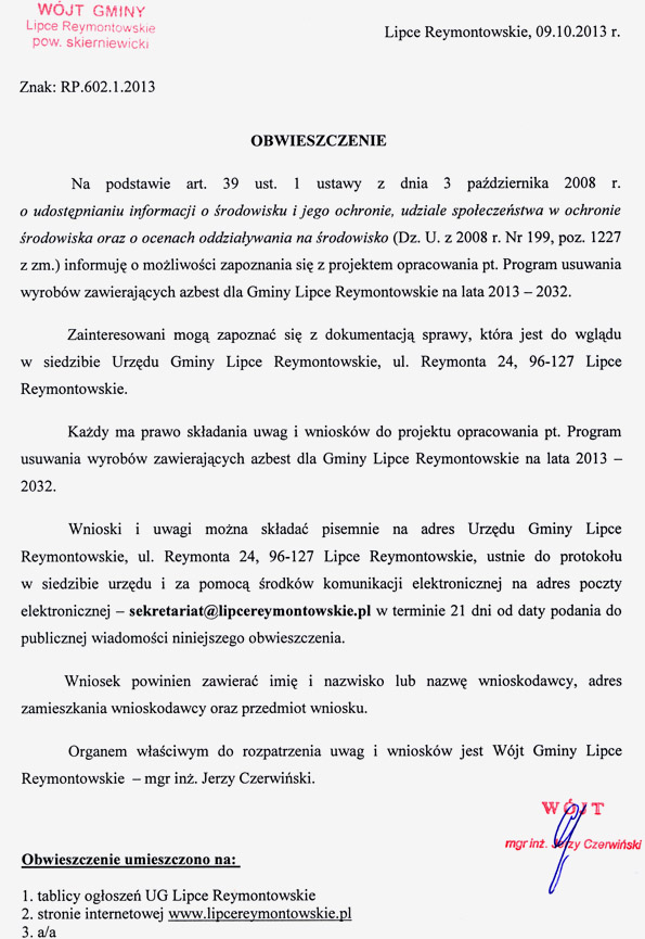 Zawiadamiam, że z treścią przedmiotowej decyzji można zapoznać się w terminie 14 dni od daty niniejszego ogłoszenia Urzędzie Gminy Lipce Reymontowskie w Referacie Rozwoju i Promocji w pokoju nr 3 w dniach poniedziałek ÷ piątek w godz.